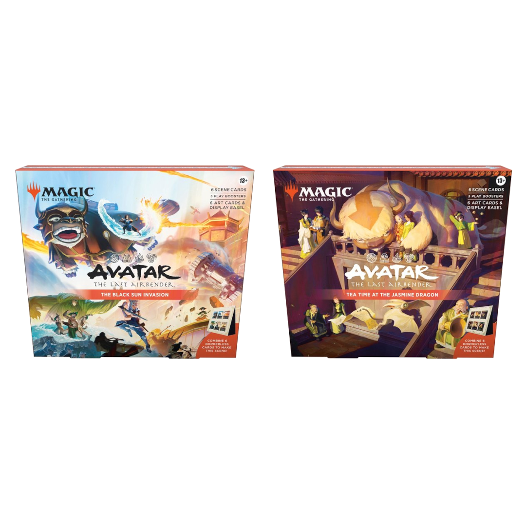 This Magic: The Gathering | Avatar: The Last Airbender Scene Box, The Black Sun Invasion, contains 6 Traditional Foil Borderless Scene Cards, 6 Art-Only Scene Cards, 3 Play Boosters, and a paper display easel. Each Play Booster contains 14 Magic: The Gathering cards, including 1–4 cards of rarity Rare or higher and 3–5 Uncommon, 6–9 Common, and 1 Land cards. One card of any rarity is Traditional Foil. The Land card is also Traditional Foil in 20% of Play Boosters.