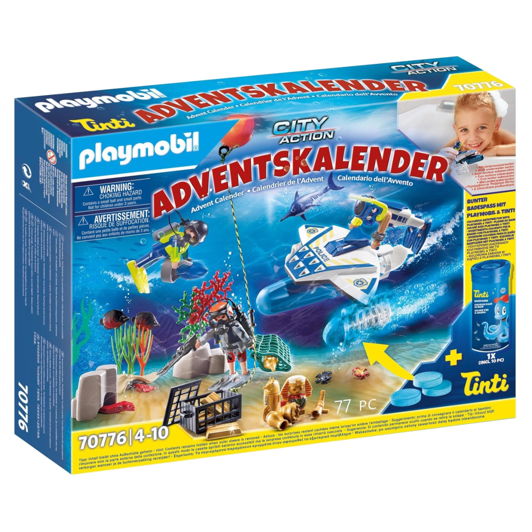 De speelset bevat een adventskalender met 24 verrassingen, drie PLAYMOBIL-figuren, een grote en een kleine duikscooter, een babyzwaardvis, een murene, twee vlindervissen, een kreeft, twee krabben, stenen, koraal en andere geweldige accessoires voor spannende onderwatermissies. Als bijzonder extraatje bevat de kalender Tinti badverf. Steek eenvoudig een gehalveerd verftablet in de netten van de duikscooter en de scooter maakt tijdens de rit coole kleuren in het water. Heerlijk badplezier met Tinti en PLAYMOBIL!