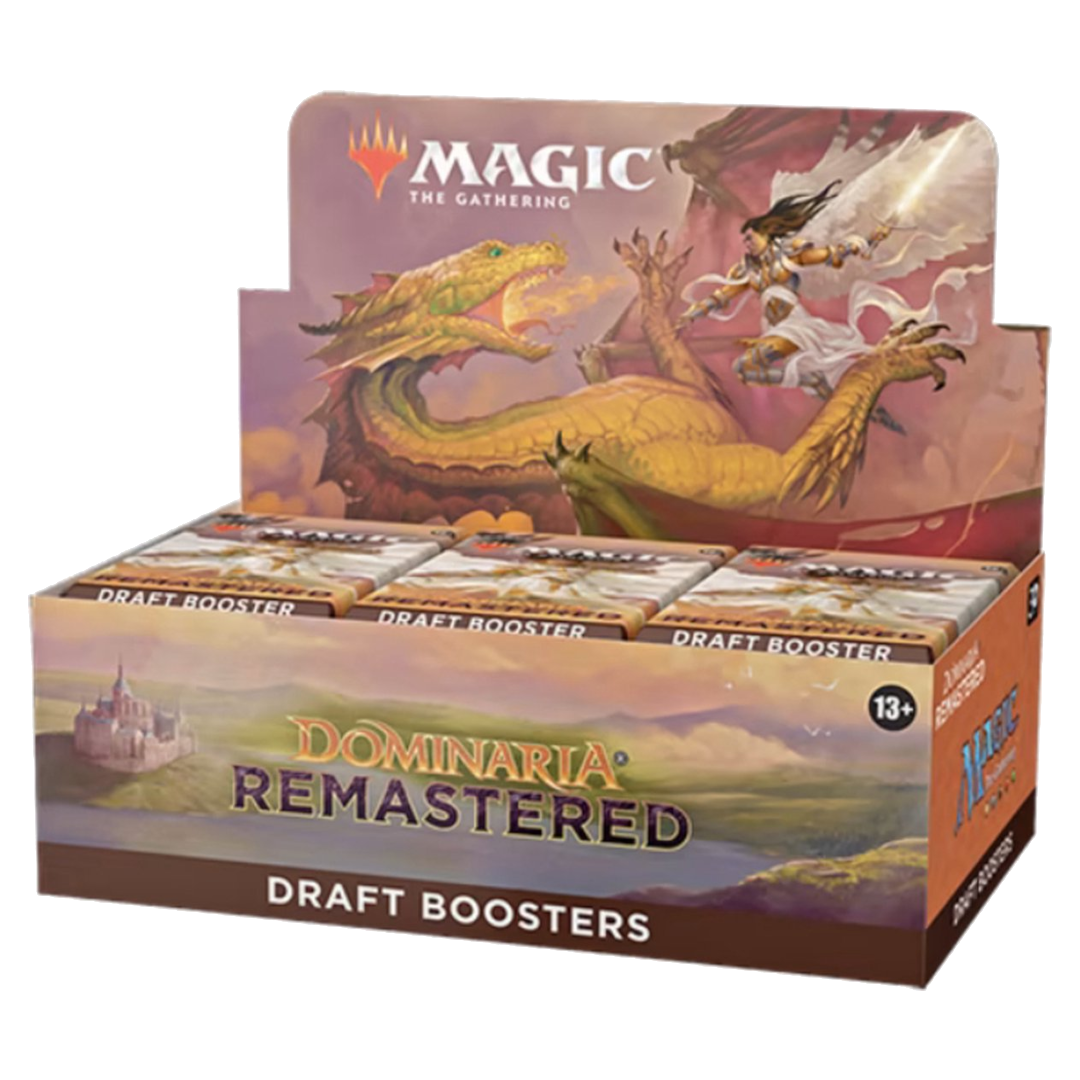 De Dominaria Remastered Draft Booster Box bevat 36 Dominaria Remastered Draft Boosters. Elke Draft Booster bevat 15 kaarten en 1 token/ad-kaart, waaronder 1 kaart met zeldzaamheid Rare of hoger en 2–4 Uncommon, 9–11 Common en 1 Retro Land-kaarten. Traditionele folie van enige zeldzaamheid vervangt een gewone in 33% van de boosters.