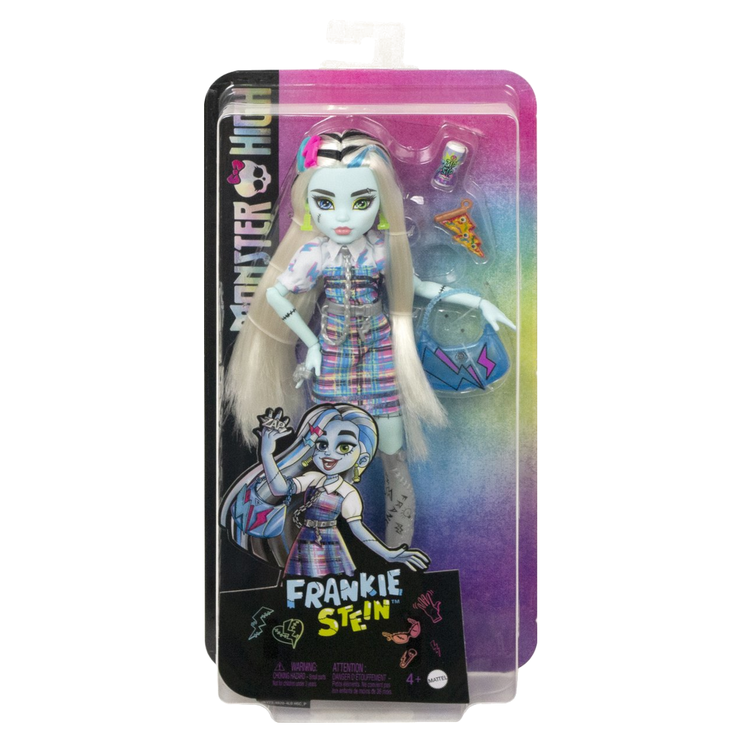 Frankie Stein-pop is klaar voor een dagje uit met de geesten! Deze Monster High-student straalt hoogspanning uit in een eng-schattige look met een opvallende handtas en twee verhalen vertellende stukken. Frankie Stein ziet er positief uit in een geruite hemdjurk met bliksemschichtaccenten. Een riem en stevige roze plateausneakers voegen modieuze angstaanjagende accenten toe. Een op maat gemaakte handtas met bliksemschichtstiksels, kleurrijke haarspeldjes en dikke sieraden maken hun opwindende ensemble compleet! Ze is klaar om altijd en overal een stijlvolle pose aan te nemen met 11 articulatiepunten!