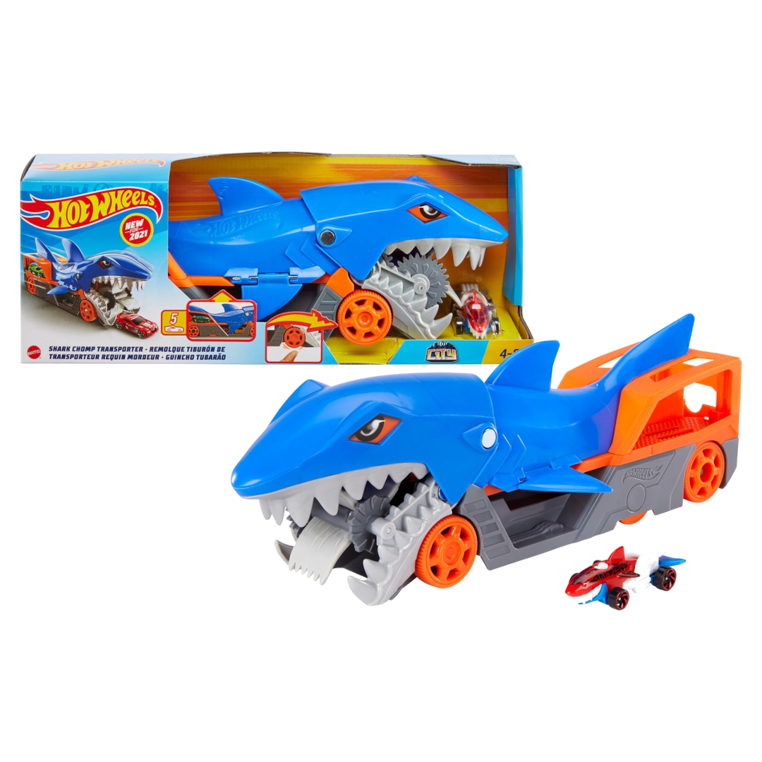 De Hot Wheels Haaienoplegger speelset is een nieuwe variant van de iconische Haaienbeet Hot Wheels auto in de vorm van een coole nieuwe transporter. Met het speciale bijtmechanisme dat wordt geactiveerd wanneer kinderen hem voortduwen, pakt de haai auto's met zijn kaken op en bewaart hij ze in zijn buik. Moet hij uitgeladen worden? Gebruik dan de uitrijhelling aan de achterkant. Het Hot Wheels Haaienoplegger voertuig wordt geleverd met 1 Hot Wheels auto (schaal 1:64) en is groot genoeg voor nog eens 4 andere auto's (apart verkrijgbaar)! Kinderen vanaf 4 jaar zetten hier graag hun tanden in! Afwijkende kleuren en versieringen mogelijk.