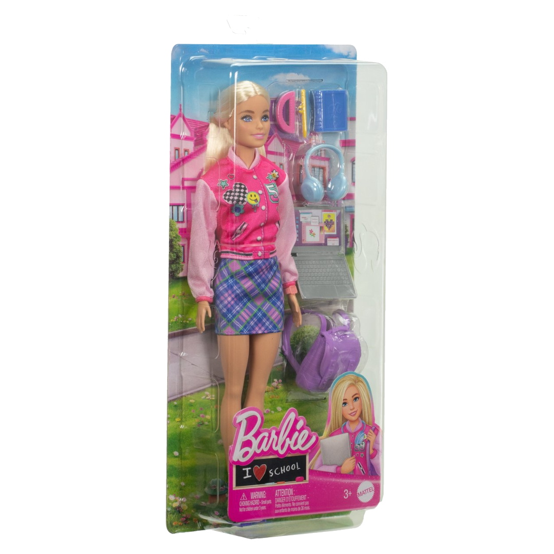 Barbie staat klaar voor haar eerste dag weer naar school! Ze huppelt door de gangen in haar roze schooljack, geruite rokje en hoge sneakers. Met accessoires als een rugzak, laptop, koptelefoon en pen die echt in haar hand past, heeft Barbie alles wat ze nodig heeft om uit te blinken dit schooljaar! Kids vinden het geweldig om schooltje te spelen met deze Barbie Dol op School set. Pop kan niet los staan. Afwijkende kleuren en versieringen mogelijk.