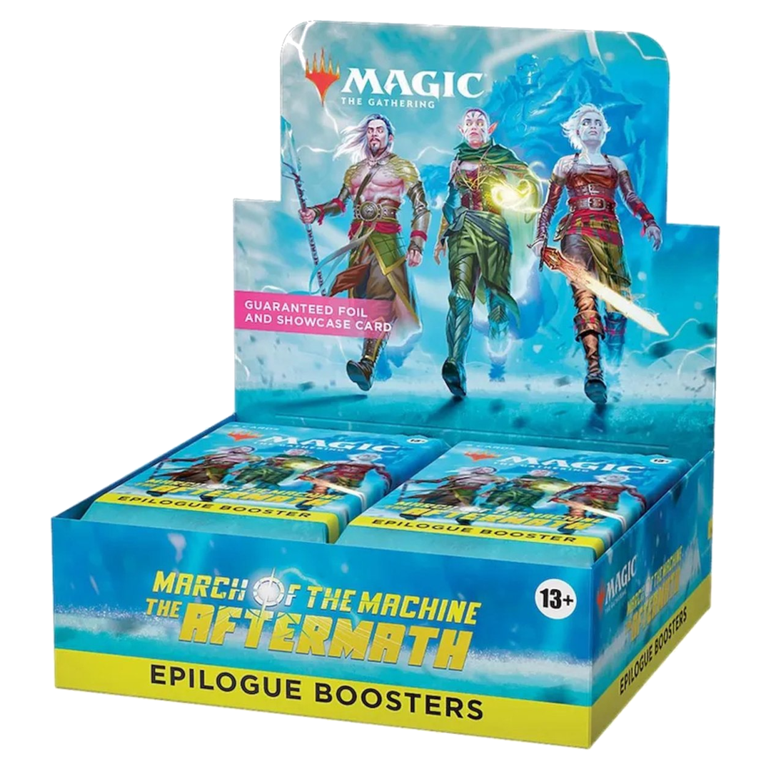 The March of the Machine: The Aftermath Epilogue Booster Box contains 24 March of the Machine: The Aftermath Epilogue Boosters. Each Epilogue Booster contains 5 cards, with a combination of 1-3 card(s) of Rarity Rare or higher and 2-4 Uncommon cards. In each pack, a total of 1-2 card(s) of any rarity are Traditional Foil.