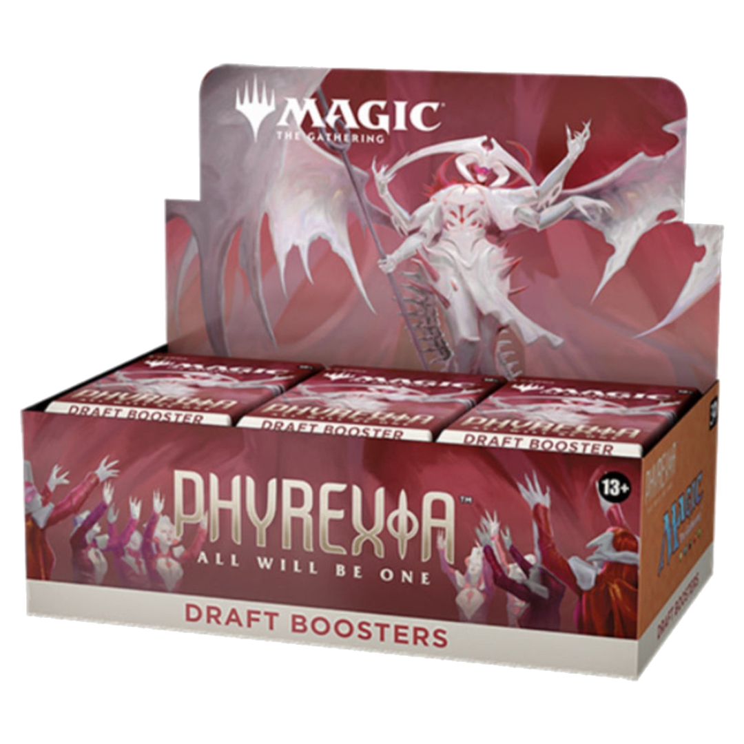 Een boosterbox Phyrexia: All Will Be One bevat 36 draft boosters. Elke draft booster van Phyrexia: All Will Be One bevat 15 Magic: the Gathering kaarten waarvan: