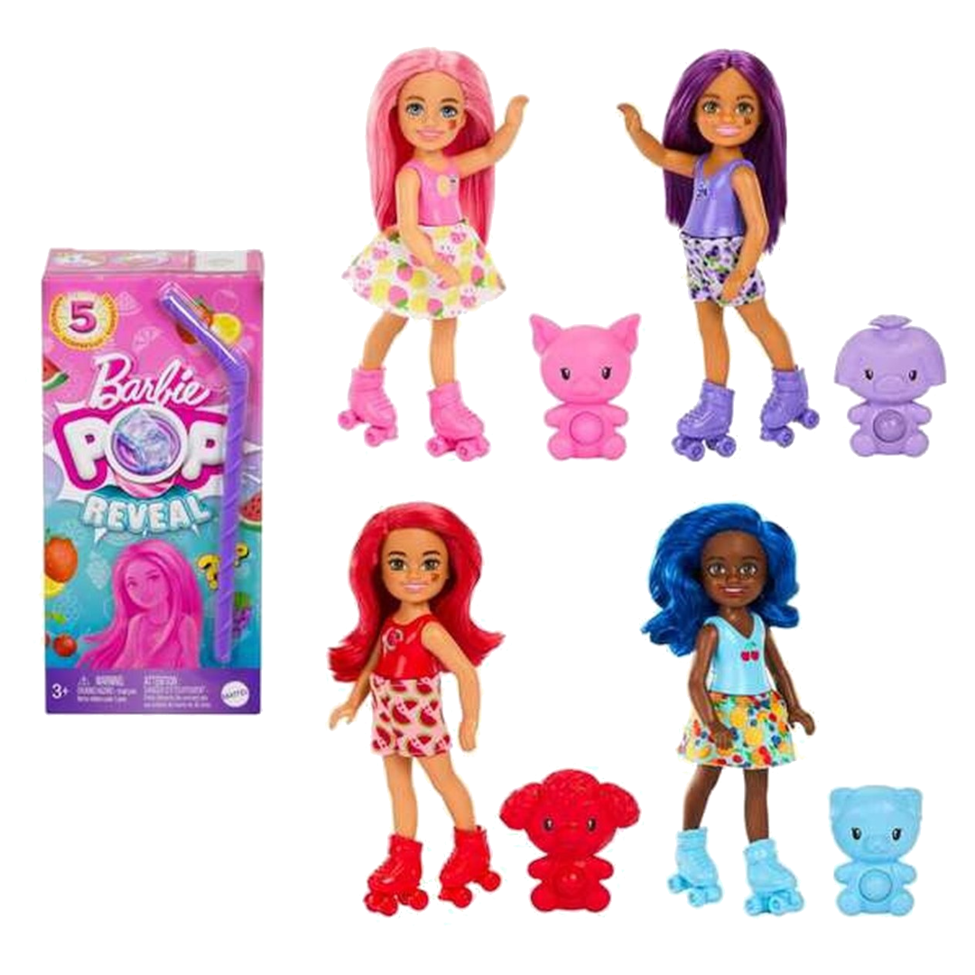 Met 5 verrassingen in een schattig sapdoosje bieden de Barbie Pop Reveal Fruit Series kleine Chelsea-poppen een geurende unboxing-ervaring. Kinderen verwijderen het rietjevormige stuk en klappen de bovenkant open om de fruitige geur vrij te geven: aardbeienlimonade, vruchtensap, watermeloen of druif. Blijf openen om een kleine, geurende pop met kleurrijk haar, 2 mystery-zakjes en een ijsemmer te vinden die daadwerkelijk opengaat om een paar schaatsen te onthullen: gebruik de emmer voor opslag of herhaal onthullingen!
